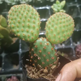 - Cây Xương Rồng Tai Thỏ Đỏ có hình ovan, thân cây có màu xanh. Khi cây phát triển có 1 thân chính và mọc 2 nhánh như tai thỏ. Hoặc cũng có nhiều trường hợp cây chỉ mọc 1 nhánh hoặc không mọc nhánh